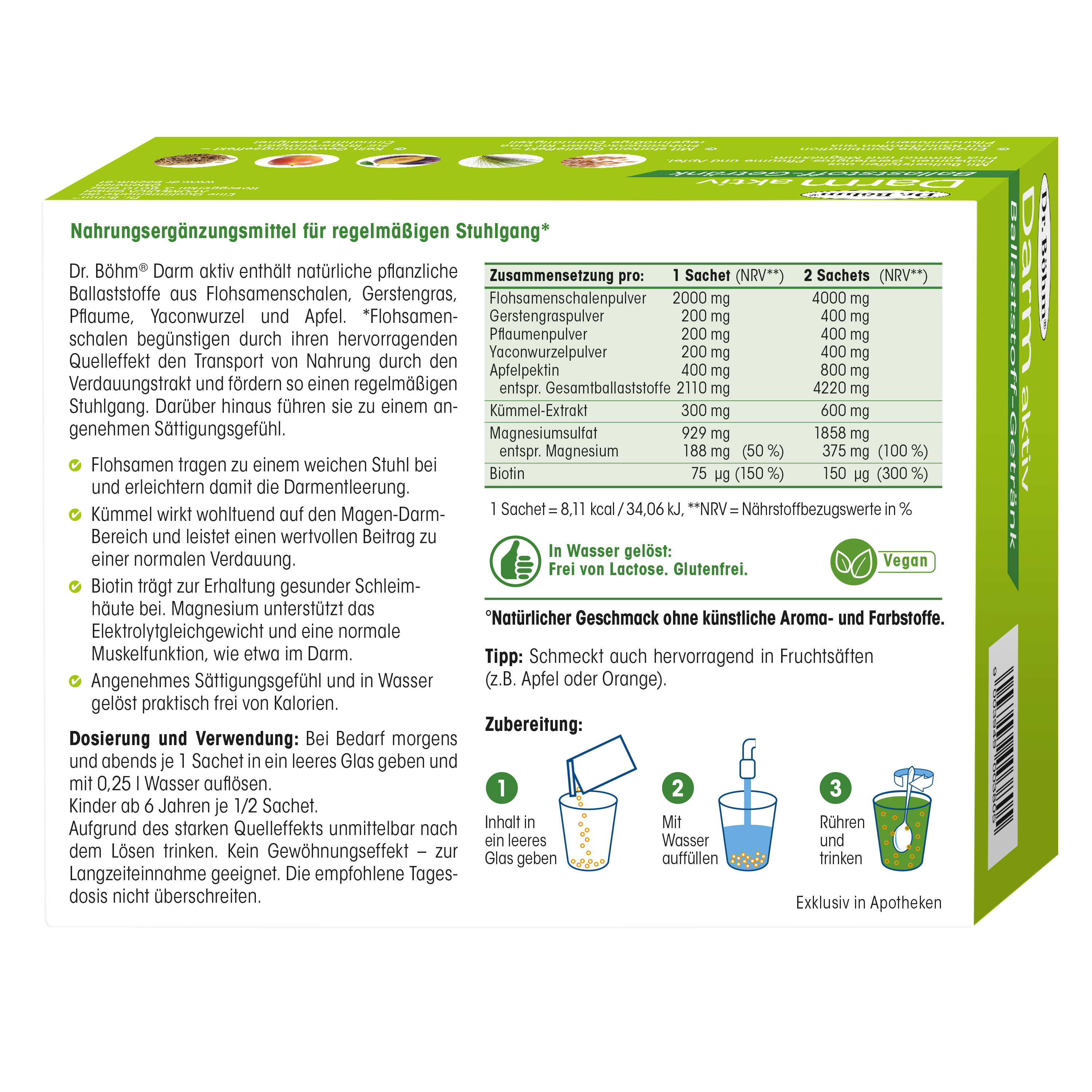 Dr. Böhm® Darm aktiv ist ein Nahrungsergänzungsmittel zur Anregung der Darmtätigkeit* bei gelegentlicher Verstopfung sowie hartem Stuhl.