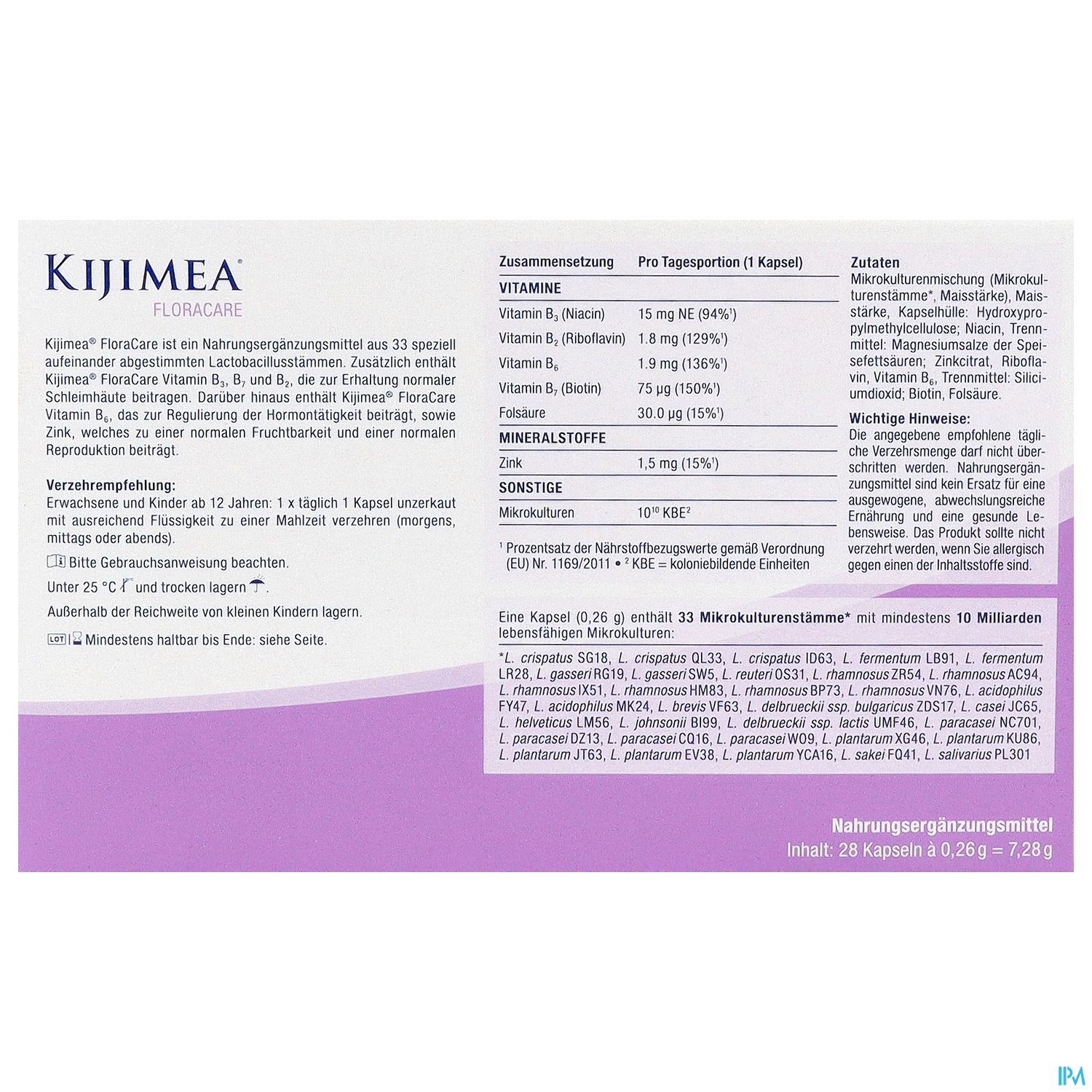Kijimea FloraCare ist ein Nahrungsgergänzungsmittel aus 33 speziell aufeinander abgestimmten Lactobacillusstämmen. Zusätzlich enthält Kijimea FloraCare Vitamin B3, B7 und B2, die zur Erhaltung normaler Schleimhäute beitragen. Darüber hinaus enthält Kijimea FloraCare Vitamin B6, das zur Regulierung der Hormontätigkeit beiträgt, sowie Folsäure und Zink.