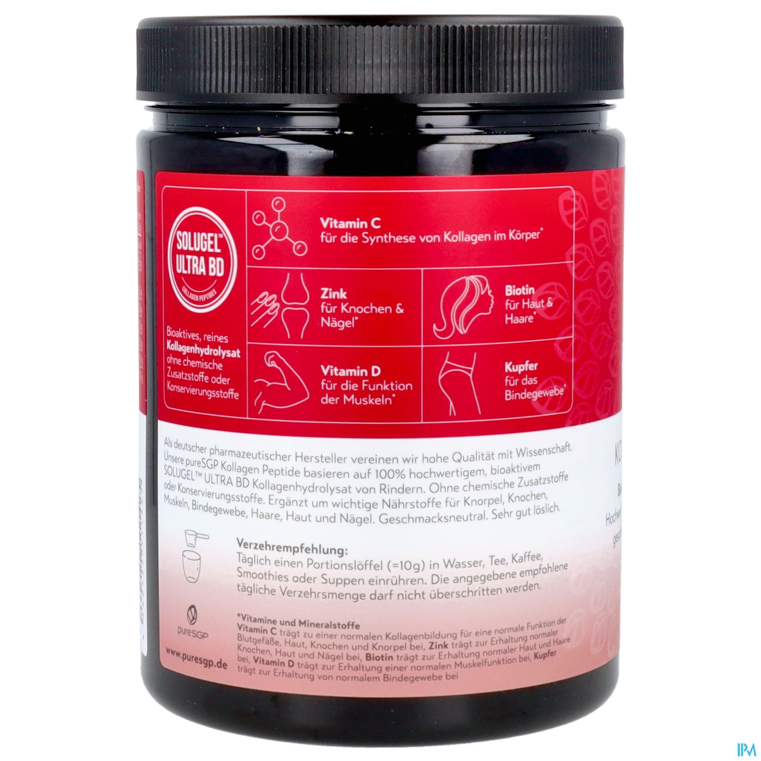 • Hohe Bioverfügbarkeit – Herkömmliche Kollagen Peptide sind so groß, dass der Körper sie schwer verarbeiten kann. pureSGP® enthält 100 % reines SOLUGEL™ ULTRA BD Kollagenhydrolysat, welches durch die enzymatische Hydrolyse sehr fein wird und damit vom Körper sehr gut aufgenommen werden kann.