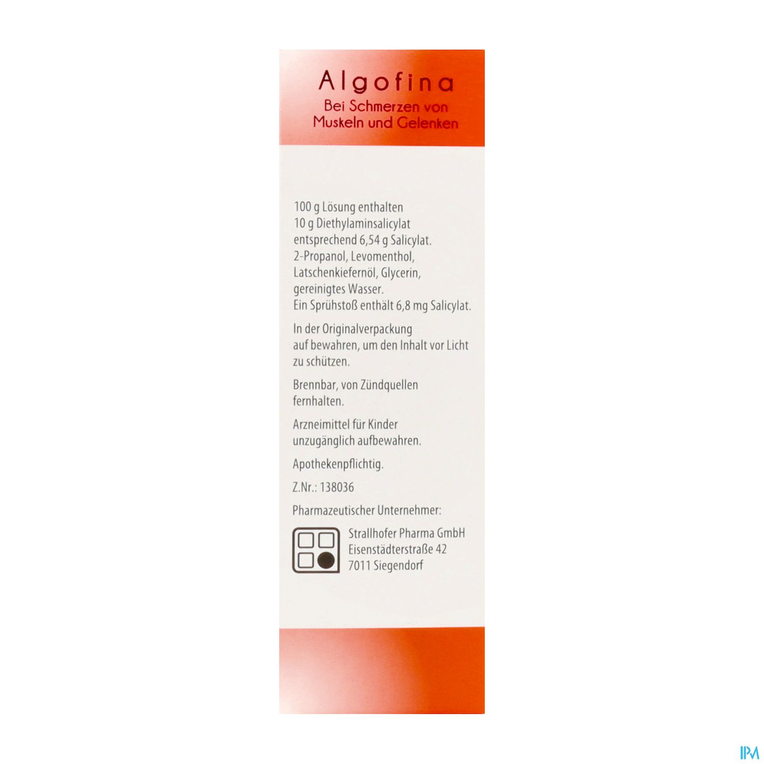 - Was Algofina enthält: Der Wirkstoff ist Diethylaminsalicylat. 100 g Lösung enthalten 10 g Diethylaminsalicylat entsprechend 6,54 g Salicylat.